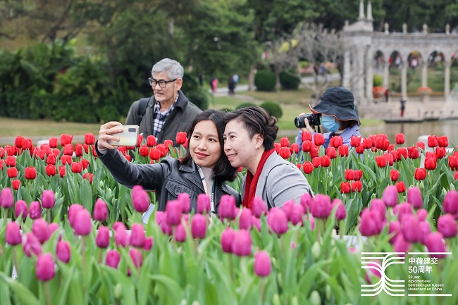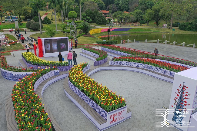 Het logo is tot leven gebracht in een rondreizende bloemeninstallatie die de vorm van het jubileumlogo heeft. Samen met het Nederlandse bedrijfsleven in China hebben we de handen ineen geslagen om een stukje Nederland naar China te brengen. De installatie is een plek waar mensen kunnen samenkomen en van de geuren en kleuren van de bloemen kunnen genieten.