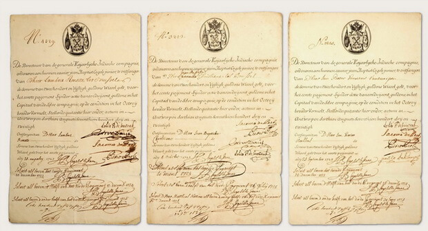 Drie aandelen van de Ostend East India Company, 1723. Afbeelding via Bornmeer.