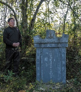Auteur Tan Hecheng bij de grafzerk van het gezin Zhou (foto door Sim Chi Yin)